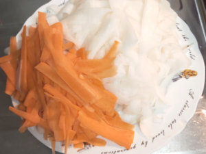 ![]() ①大根と人参は皮をむいてから、ピーラーでひらひらの薄切りにします。 |