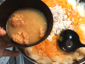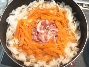 ![]() ③鍋が沸騰したら、中央に豚こまを入れ、周囲に大根とにんじんを敷き詰めます。 |