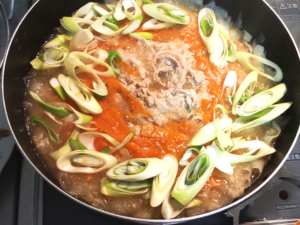 ![]() ⑥長ネギを斜め薄切りにして、鍋に加え、さらに蓋をして2~3分煮ましょう。 |
