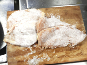 ①鶏むね肉は厚みを2枚に開き、片栗粉をまんべんなくまぶします。