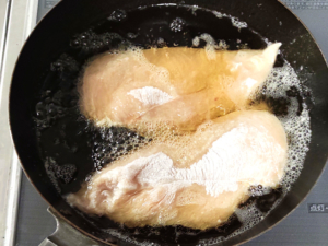 ②180度の油で、鶏肉の両面がきつね色になるまでしっかり目に揚げましょう。