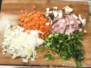 ③人参と玉ねぎは皮をむいてみじん切りに、椎茸、ピーマンもみじん切り、ベーコンも同じ大きさに切ります。
