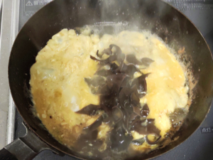 ⑧別のフライパンに多めに油(分量外)を引き、卵、きくらげを一緒に炒めます。