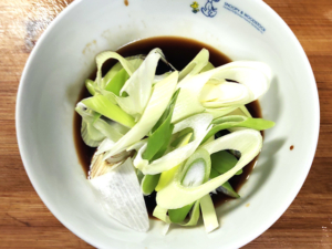 ⑩ネギは斜め薄切りにし、ユウリンチーの鶏肉と片栗粉以外の材料を耐熱容器に入れ、レンジで2分ほど加熱してソースを作りましょう。