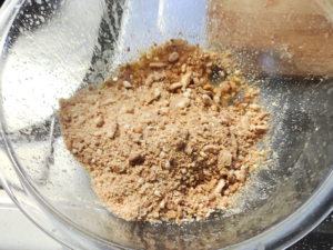 ![]() ③ビスケットは細かく砕き、マーガリンをレンジで30秒加熱して溶かしたものとよく混ぜます。 |