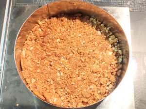 ![]() ④ビスケットにマーガリンがなじんだら、ケーキ型の底にびっしり敷き詰め、使うまで冷蔵庫に入れておきましょう。 (セルクルの場合は、専用の台の上に型ごと乗せてください。) |