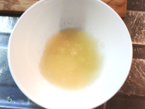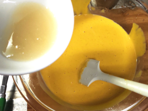 ![]() ⑩ふやかしたゼラチンをレンジで20秒ほど加熱し、完全に溶けたら、南瓜のボールに加え、しっかりと混ぜ合わせます。 |