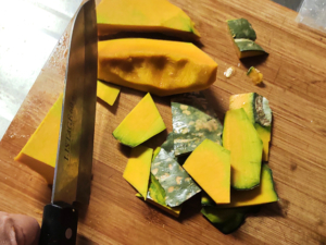 ![]() ⑤南瓜は種とワタを取り、皮を包丁で切り取ります。 |