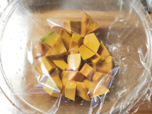 ![]() ⑥耐熱ボールに皮を取った南瓜を入れ、一旦水にくぐらせてから、ラップをしてレンジで6~8分加熱します。 (竹串がすっと通る柔らかさまでが目安です。) |