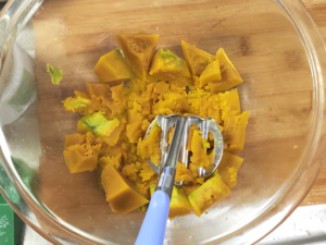 ![]() ⑦南瓜が温かいうちに、マッシャーなどで細かくつぶしましょう。 |