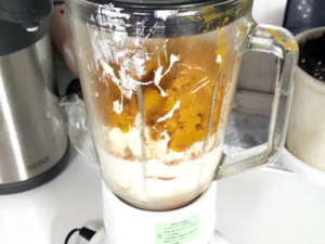 ![]() ⑧ミキサーに、牛乳、砂糖、クリームチーズ(スプーンで小さくすくいながら)、南瓜を入れて攪拌します。 ⑨生地が滑らかになるまで、しっかりと混ぜて液体状にし、ボールにあけましょう。 |