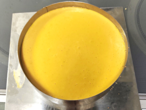 ![]() ⑪冷蔵庫から型を取り出し、南瓜液をそっと流し入れ、このまま冷蔵庫で3時間ほど冷やしましょう。 |