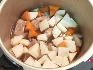 ![]() ③圧力鍋にスペアリブを入れ、切った大根と人参が平らになるように敷き詰めます。 |