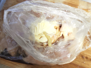 ![]() ②ポリ袋などに鶏肉、砂糖、醤油、マヨネーズ、生姜を加え、全体を袋の上からよくもみこみ、そのまま10分放置します。 |