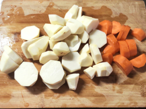![]() ①里芋と人参は皮をむき、それぞれ1cm幅くらいの輪切りにします。 |