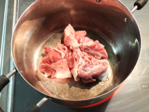 ![]() ③香りがでたら、食べやすく切った豚肉を鍋に加え、軽く白くなるまで炒めます。 |