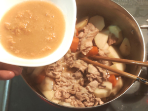 ![]() ⑥里芋が柔らかくなったら、煮汁を使って味噌を溶き、鍋に加えます。 ⑦全体をよく混ぜ合わせ、しっかりと味噌を溶かしましょう。 |