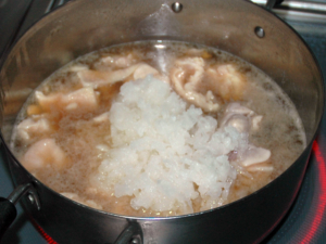 ![]() ④鍋が沸騰したら、鶏肉と大根おろしを加え、蓋をして、10分程煮ます。 |