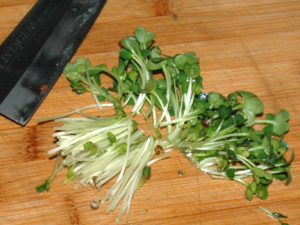 ![]() ⑤貝割れは根を落とし、半分の長さに切りましょう。 |
