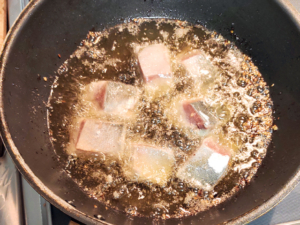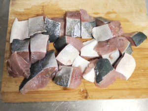 ![]() ①ぶりの切り身は大きめの一口大に切ります。 |
