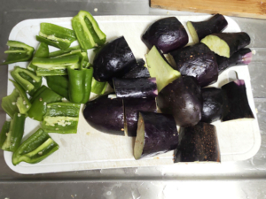 ![]() ②ナスは皮をむき大き目の一口大に、ピーマンは種とヘタを取り食べやすい大きさに切ります。 |