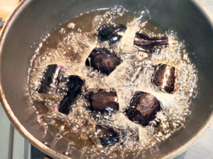 ![]() ③鍋に油を多め(分量外)に用意し、190度の油でまずナスを揚げます。 ④ナスを箸でつまんでみて、柔らかいようなら取り出しましょう。 |