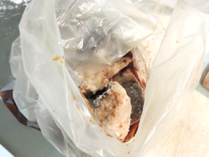![]() ⑥ブリに片栗粉を全体にまぶしましょう。 |