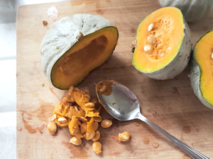 ![]() ①南瓜は種とワタを取り除き、外側の皮部分は汚れたか所だけ切り落とします。 |