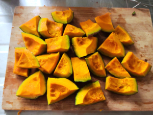 ![]() ②南瓜を食べやすい大きさに切りましょう。 |