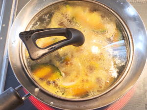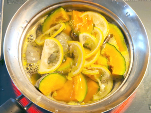 ![]() ④砂糖が溶けたら、南瓜とゆずの皮の薄切りを加え、一旦煮立たせましょう。 |