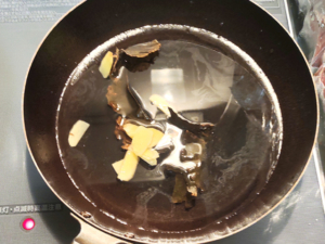 ![]() ①フライパンか鍋に、水、酒、昆布、生姜の薄切りを入れて火にかけ、一旦沸騰させます。 |