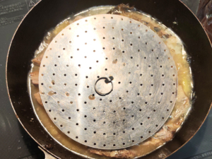 ![]() ⑥落とし蓋をして、さらに2~3分加熱し、蓋を取り、強火で2~3分加熱して、煮汁が少なくなったらOK。 (強火にかけると焦げやすいので、近くで様子を見て、ときどき揺すってください。) |