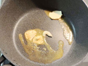 ![]() ③フライパンにマーガリンとにんにくを入れて、弱火でマーガリンを溶かします。 |