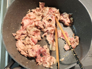 ![]() ④豚肉も加え、豚肉が白くなるまでしっかり目に火を通しましょう。 |