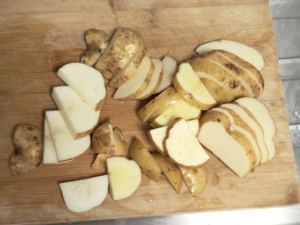 ![]() ④じゃがいもは皮をよく洗って泥を落とし、皮つきのまま、8mm厚さの半月切りにしましょう。 |