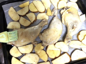 ![]() ⑥天板にオーブンシートを引き、じゃがいもが重ならないように並べ、鶏肉も取り出し、皮を上にしてスペースに出します。 ⑦じゃがいもに使った調味油を刷毛で、鶏肉の皮目に塗って準備は完了。 |
