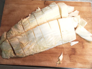 ②白菜はざく切りにしましょう。