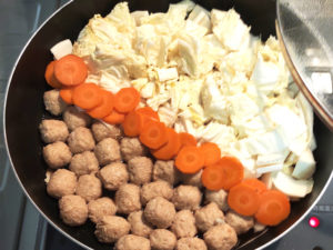 ③鍋が煮立ったら、鍋半分に凍ったままの肉団子を入れ、もう半分に白菜を敷き詰めます。