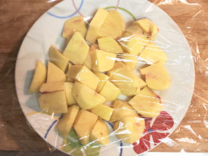 ⑤じゃがいもは皮をむき、一口大に切ってから耐熱皿に乗せ、ラップをしてレンジで8分ほど加熱します。