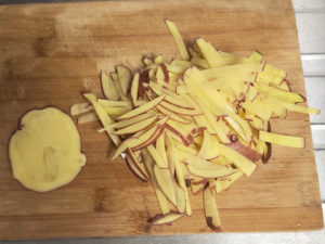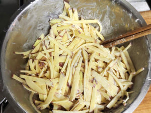 ![]() ①じゃがいもは皮をよく洗って泥を落とし、皮つきのまま細切りにします。 |