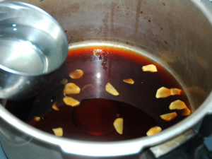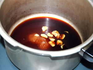 ![]() ①圧力鍋に醤油を入れて、沸騰させます。 |