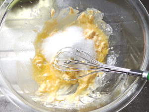 ![]() ②耐熱ボールにマーガリンを入れ、レンジで20秒ほど加熱し、柔らかくしましょう。 ③グラニュー糖も加え、白っぽく、砂糖のザラザラ感が消えるまでしっかりと混ぜます。 |