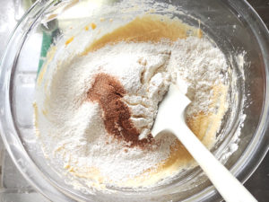 ![]() ⑦薄力粉と強力粉、ベーキングパウダーを合わせたものの半量とシナモンパウダーをふるい入れ、ゴムベラでさっくりと混ぜ合わせます。 |