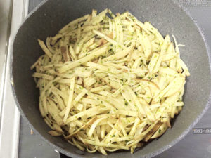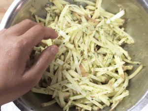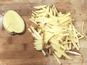①じゃがいもは皮をよく洗って泥を落とし、皮つきのまま細切りにします。