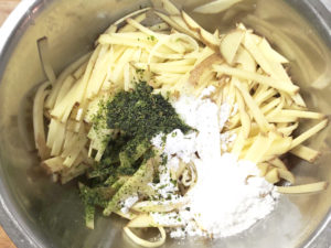 ②大きめのボールに、じゃがいも、青のり、片栗粉、塩、酒を加えて混ぜましょう。