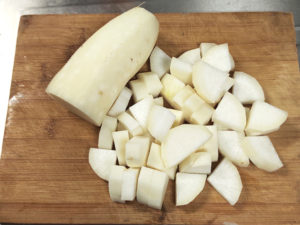 ![]() ①大根は皮をむき、1cm幅くらいのいちょう切りにします。 |
