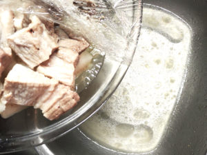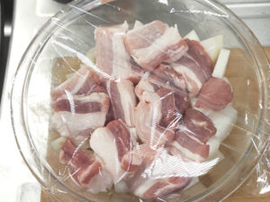 ![]() ②豚バラ肉も厚さ1cm幅に切りましょう。 |