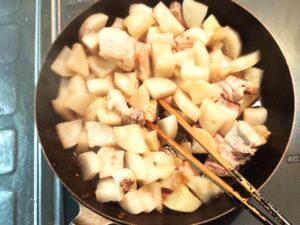 ![]() ⑦フライパンに大根と豚肉を加え、全体に味を絡めたらOK。 |