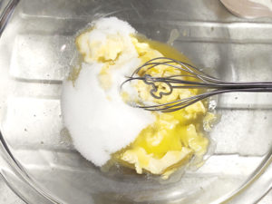 ![]() ①耐熱ボールにマーガリンを入れ、レンジで20秒ほど加熱し、マヨネーズ状まで柔らかくします。 ②グラニュー糖を加え、ザラザラ感がなくなり、白っぽくなるまですり混ぜましょう。 |