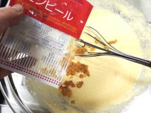 ![]() ③ボールに卵を1個ずつ割入れ、その都度よく混ぜましょう。 (卵は室温に置いたものでないと、分離します。) |